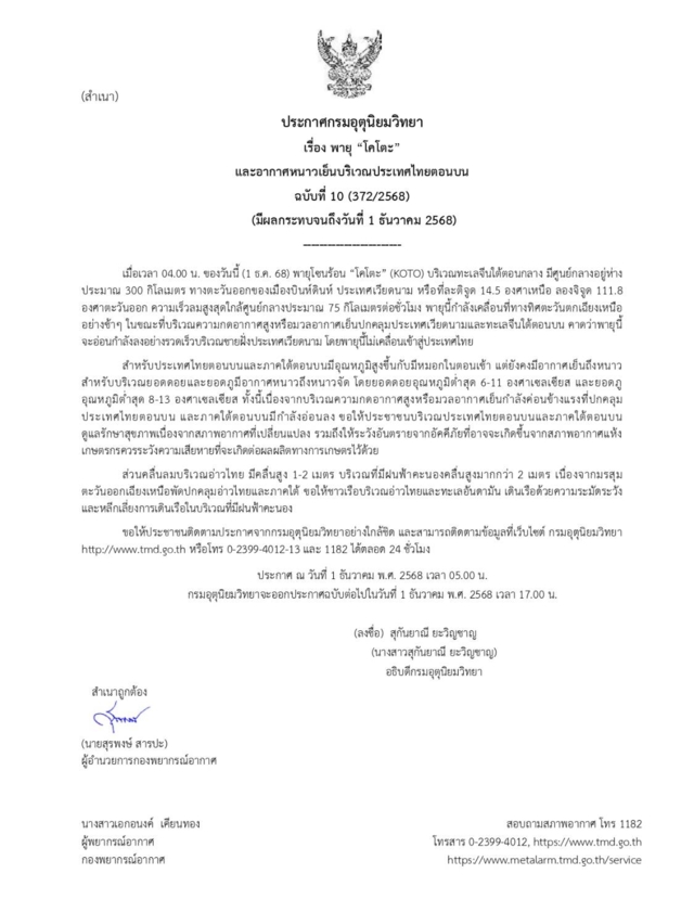 กรมอุตุนิยมวิทยา ประกาศเตือน เรื่อง พายุ "โคโตะ" และอากาศหนาวเย็นบริเวณประเทศไทยตอนบน ฉบับที่ 10 (มีผลกระทบจนถึงวันที่ 1 ธ.ค. 2568) เมื่อเวลา 04.00 น. ของวันนี้ (1 ธ.ค. 2568) พายุโซนร้อน "โคโตะ" (KOTO) บริเวณทะเลจีนใต้ตอนกลาง มีศูนย์กลางอยู่ห่างประมาณ 300 กิโลเมตร ทางตะวันออกของเมืองบินห์ดินห์ ประเทศเวียดนาม หรือที่ละติจูด 14.5 องศาเหนือ ลองจิจูด 111.8 องศาตะวันออก ความเร็วลมสูงสุดใกล้ศูนย์กลางประมาณ 75 กิโลเมตรต่อชั่วโมง พายุนี้กำลังเคลื่อนที่ทางทิศตะวันตกเฉียงเหนืออย่างช้าๆ ในขณะที่บริเวณความกดอากาศสูงหรือมวลอากาศเย็นปกคลุมประเทศเวียดนามและทะเลจีนใต้ตอนบน คาดว่าพายุนี้จะอ่อนกำลังลงอย่างรวดเร็วบริเวณชายฝั่งประเทศเวียดนาม โดยพายุนี้ไม่เคลื่อนเข้าสู่ประเทศไทย