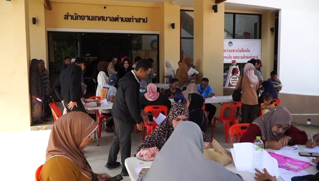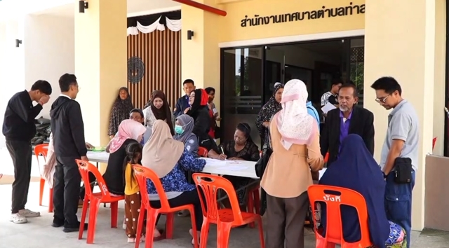 นายมะสดี หะยีปิ นายกเทศมนตรีตำบลท่าสาป เปิดเผยว่า พื้นที่ ต.ท่าสาป ได้รับผลกระทบจากสถานการณ์อุทกภัยอย่างหนักถึง 100% ครอบคลุม 6 หมู่บ้าน จำนวน 3,566 ครัวเรือน หรือกว่า 5,635 คน ทางเทศบาลฯ ได้เร่งดำเนินการตามข้อสั่งการของรองผู้ว่าฯ โดยได้ประชุมผู้นำท้องถิ่นและแจกจ่ายแบบฟอร์มไปก่อนหน้านี้แล้ว ซึ่งในวันแรกนี้มีประชาชนเข้ามาลงทะเบียนแล้วกว่า 300 คน ส่วนการดำเนินการช่วยเหลือด้านถุงยังชีพ ได้มอบให้กับผู้ประสบภัยทั้งหมดเรียบร้อยแล้ว สำหรับการเปิดรับลงทะเบียน ณ เทศบาลตำบลท่าสาป จะมีขึ้นระหว่างวันที่ 30 พฤศจิกายน - 3 ธันวาคม 2568 เน้นย้ำ ประชาชนที่ได้รับผลกระทบรีบมายื่นเอกสารตามกำหนดเวลาไม่เกินวันที่ 3 ธ.ค 68 เนื่องจากต้องส่งเอกสารไปยังเข้าอำเภอ วันที่ 5 ธ.ค และ วันที่ 4 ธ.ค จะต้องทำประชาคม หลังจากนั้นก็จะนำส่งต่อจังหวัด ถ้าลงทะเบียนเร็วชุดแรกก็จะได้เร็ว