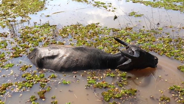 ด้านนายมานิตย์ ทองดำ อายุ 68 ปี เจ้าของควายน้ำทะเลน้อย มรดกโลกทางด้านการเกษตร บอกว่า ทุกปีช่วงรอยต่อฝนตก และแล้ง มีน้ำท่วมทุ่งหญ้า ทำให้ควายน้ำปรับตัวเองไม่ทัน ล้มตายลง และวันนี้ก็เช่นกันควายของตัวเองก็เริ่มช็อกแสงแดดเหมือนกับของเพื่อนๆ รายอื่นที่เริ่มตายลงแล้วนับสิบตัว