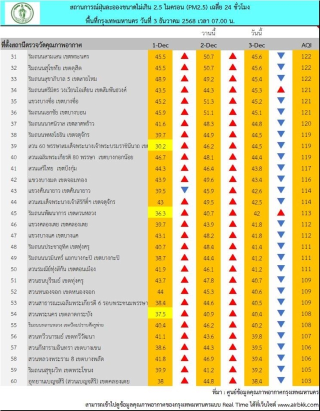 ศูนย์ข้อมูลคุณภาพอากาศกรุงเทพมหานคร รายงานสถานการณ์ฝุ่นละอองขนาดไม่เกิน 2.5 ไมครอน (PM 2.5) ในกรุงเทพมหานคร ประจำวันที่ 3 ธ.ค. 2568 เวลา 07:00 น. ค่าเฉลี่ยของกรุงเทพมหานคร 47.1 มคก./ลบ.ม. เริ่มมีผลกระทบต่อสุขภาพ (ค่ามาตรฐาน 37.5 มคก./ลบ.ม.) โดยฝุ่นละอองมีแนวโน้มลดลง มีค่าฝุ่นเกินมาตรฐานอยู่ในระดับสีส้ม เริ่มมีผลกระทบต่อสุขภาพ 62 พื้นที่