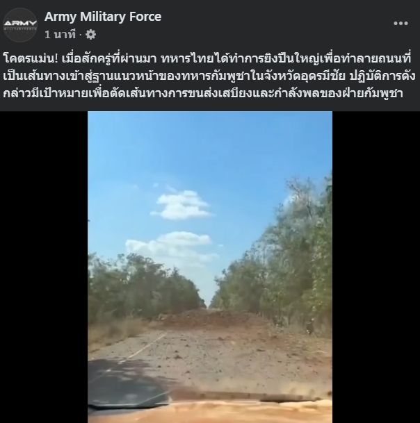 พร้อมระุบข้อความว่า โคตรแม่น! เมื่อสักครู่ที่ผ่านมา ทหารไทยได้ทำการยิงปืนใหญ่เพื่อทำลายถนนที่เป็นเส้นทางเข้าสู่ฐานแนวหน้าของทหารกัมพูชาในจังหวัดอุดรมีชัย ปฏิบัติการดังกล่าวมีเป้าหมายเพื่อตัดเส้นทางการขนส่งเสบียงและกำลังพลของฝ่ายกัมพูชา