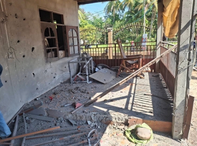 สะเก็ดระเบิดกระจายไปถูกตัวบ้าน ทำให้บ้านเสียหายทั้งหลัง และสะเก็ดระเบิด ยังกระเด็นไปถูกบ้านข้างๆอีก 1 หลัง(เสียหายเล็กน้อย) เจ้าของบ้านคนเดียวกัน เบื้องต้นไม่มีผู้ได้รับบาดเจ็บเพราะไม่มีคนอยู่ในบ้านได้อพยพไปศูนย์พักพิงฯ ทั้งหมดแล้ว
