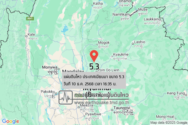 (10 ธ.ค. 2568) กองเฝ้าระวังแผ่นดินไหว กรมอุตุนิยมวิทยา ได้ประกาศ แผ่นดินไหว ในพื้นที่ ประเทศเมียนมา วันนี้ (10 ธ.ค. 2568) เวลา 16.35 น. ขนาด 5.3 ความลึก 10 กิโลเมตร โดยจุดศูนย์กลางอยู่ทางทิศตะวันตกเฉียงเหนือของ อ.ปางมะผ้า จ.แม่ฮ่องสอน ประมาณ 368 กม. ยังไม่พบรายงานความเสียหาย หรือจุดในไทยว่ารับรู้ถึงแรงสั่นสะเทือนหรือไม่