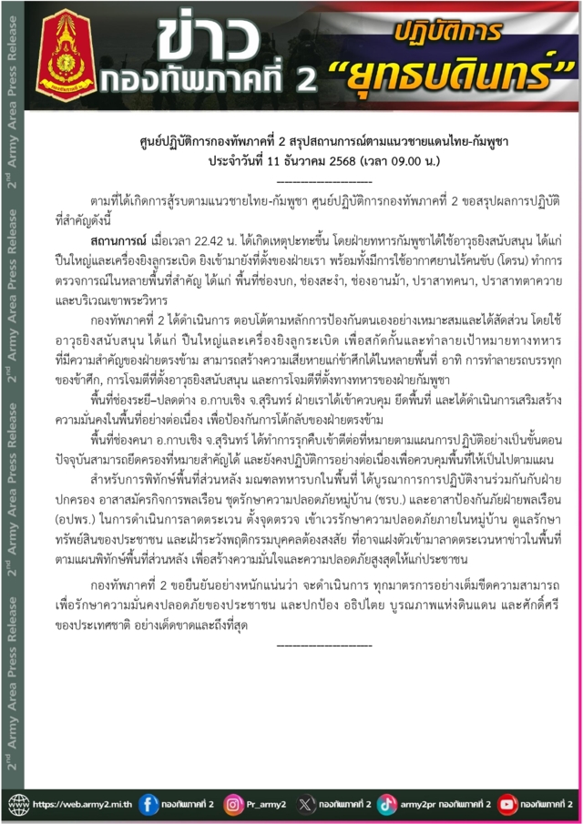 วันที่ 11 ธ.ค. 68 พ.ท.ฐิติพงศ์ เฟื่องจันทร์ ผู้ช่วยโฆษกศูนย์ปฏิบัติการกองทัพภาคที่ 2 (ศปก.ทภ.2) สรุปสถานการณ์ตามแนวชายแดนไทย-กัมพูชา ประจำวันที่ 11 ธ.ค. 68 (เวลา 09.00 น.) ว่า ตามที่ได้เกิดการสู้รบตามแนวชายไทย-กัมพูชา ศูนย์ปฏิบัติการกองทัพภาคที่ 2 ขอสรุปผลการปฏิบัติที่สำคัญดังนี้