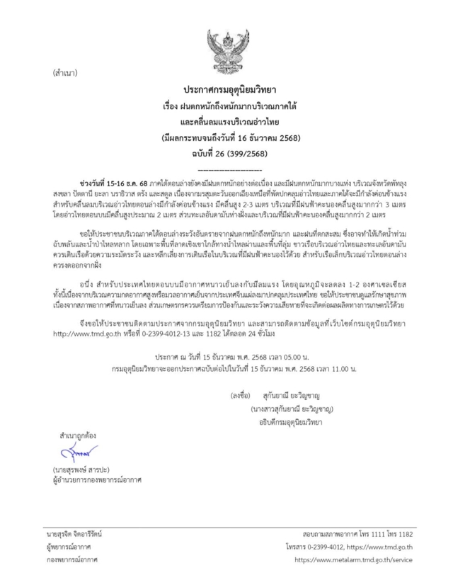 กรมอุตุนิยมวิทยา ประกาศเตือน เรื่อง ฝนตกหนักถึงหนักมากบริเวณภาคใต้ และคลื่นลมแรงบริเวณอ่าวไทย (มีผลกระทบจนถึงวันที่ 16 ธ.ค. 2568) ฉบับที่ 26 ช่วงวันที่ 15-16 ธ.ค. 2568 ภาคใต้ตอนล่างยังคงมีฝนตกหนักอย่างต่อเนื่อง และมีฝนตกหนักมากบางแห่ง บริเวณ จ.พัทลุง สงขลา ปัตตานี ยะลา นราธิวาส ตรัง และสตูล เนื่องจากมรสุมตะวันออกเฉียงเหนือที่พัดปกคลุมอ่าวไทยและภาคใต้จะมีกำลังค่อนข้างแรง สำหรับคลื่นลมบริเวณอ่าวไทยตอนล่างมีกำลังค่อนข้างแรง มีคลื่นสูง 2-3 เมตร บริเวณที่มีฝนฟ้าคะนองคลื่นสูงมากกว่า 3 เมตร โดยอ่าวไทยตอนบนมีคลื่นสูงประมาณ 2 เมตร ส่วนทะเลอันดามันห่างฝั่งและบริเวณที่มีฝนฟ้าคะนองคลื่นสูงมากกว่า 2 เมตร