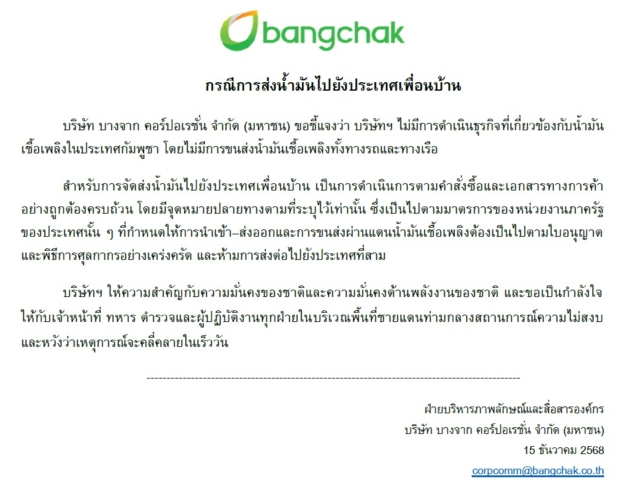 วันนี้ (15 ธ.ค. 68) บริษัท บางจาก คอร์ปอเรชั่น จำกัด (มหาชน) ชี้แจง ไม่ได้ส่งน้ำมันไปยัง "กัมพูชา" ทั้งทางรถและทางเรือ