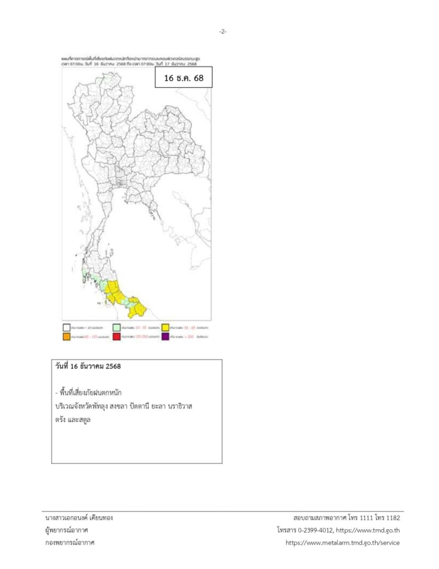 กรมอุตุนิยมวิทยา ประกาศเตือน เรื่อง ฝนตกหนักถึงหนักมากบริเวณภาคใต้ และคลื่นลมแรงบริเวณอ่าวไทย (มีผลกระทบจนถึงวันที่ 16 ธ.ค. 2568) ฉบับที่ 30 ภาคใต้ตอนล่างยังคงมีฝนตกหนักบางแห่ง บริเวณจังหวัดพัทลุง สงขลา ปัตตานี ยะลา นราธิวาส ตรัง และสตูล เนื่องจากมรสุมตะวันออกเฉียงเหนือที่พัดปกคลุมอ่าวไทยและภาคใต้มีกำลังค่อนข้างแรง สำหรับคลื่นลมบริเวณอ่าวไทยตอนล่างมีกำลังค่อนข้างแรง มีคลื่นสูง 2-3 เมตร บริเวณที่มีฝนฟ้าคะนองคลื่นสูงมากกว่า 3 เมตร โดยอ่าวไทยตอนบนมีคลื่นสูงประมาณ 2 เมตร ส่วนทะเลอันดามันห่างฝั่งและบริเวณที่มีฝนฟ้าคะนองคลื่นสูงมากกว่า 2 เมตร