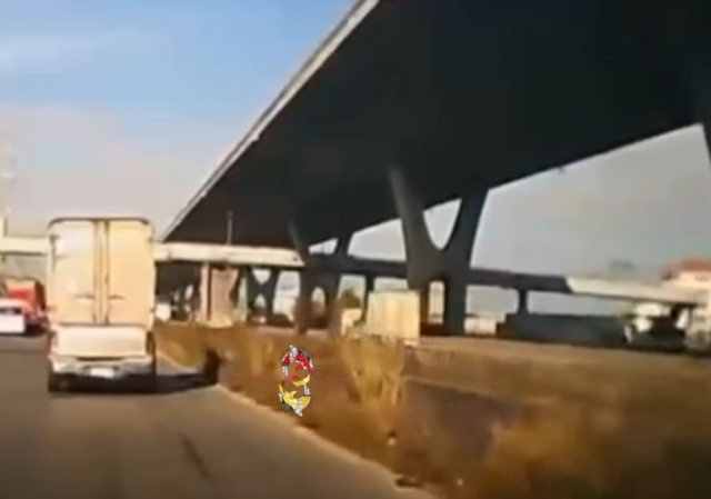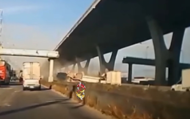 โดยเป็นภาพวินาที ดัมพ์ของรถบรรทุกค้างวิ่งไปอย่างไว ก่อนจะไปฟาดกับสะพานลอยคนข้าม
