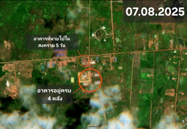 วันที่ 07.08.2025 คือภาพหลังจากสงคราม 5 วันที่อาคารซ้ายบนได้หายไป