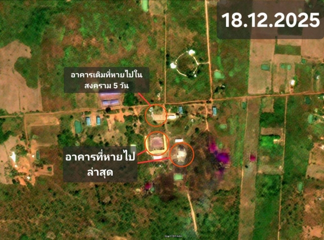 (19 ธ.ค. 2568) เพจ Thai Burma railway ทางรถไฟสายมรณะ เปิดภาพถ่ายดาวเทียม พบว่าคลังอาวุธของกองพลสนับสนุนที่ 3 ของกัมพูชาที่ถูกทำลายหายไป จากภาพถ่ายดาวเทียม ซึ่ง พล.สสน.3 ของเขมรเป็นกำลังหลักในการรบแถบ จ.พระวิหาร