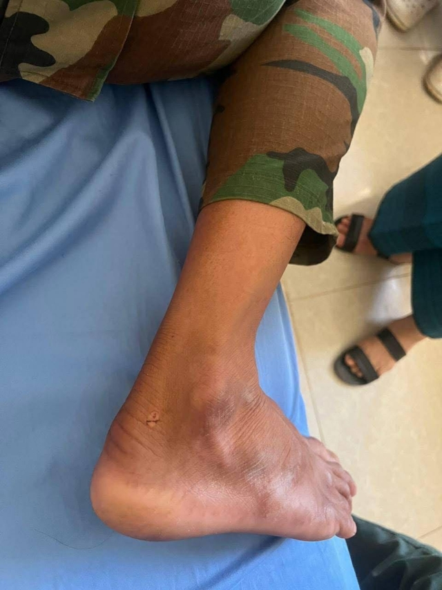 ภาพที่ทางการกัมพูชากล่าวอ้างว่า ทหารฝ่ายตนได้รับบาดเจ็บจากสุนัขบ้าของทหารไทยกัดเข้าที่เอ็นร้อยหวาย จนมีอาการปวดบวมอย่างรุนแรง