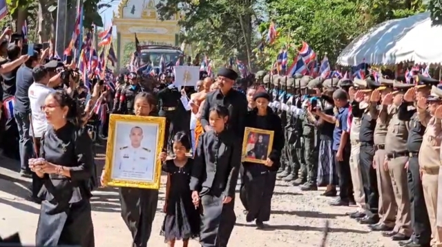 บรรยากาศที่ วัดห้วยปอ อำเภอประโคนชัย จังหวัดบุรีรัมย์ พบมีประชาชน นำธงชาติมาโบกสะบัด พร้อมทั้งส่วนราชการ และภาคเอกชน เข้ามารอรับร่างของ จ่าสิบเอกสำเริง คลังประโคน หรือ จ่าเริง วีรบุรุษที่สละชีพปกป้องเนิน 350 แผ่นดินไทย