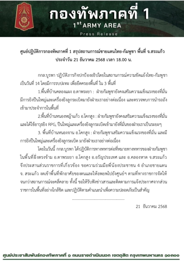 ศูนย์ปฏิบัติการกองทัพภาคที่ 1 สรุปสถานการณ์ชายแดนไทย-กัมพูชา พื้นที่ จ.สระแก้ว ประจำวัน 21 ธันวาคม 2568 เวลา 18.00 น. กกล.บูรพา ปฏิบัติภารกิจปกป้องอธิปไตยในสถานการณ์ความขัดแย้งไทย-กัมพูชา เป็นวันที่ 14 โดยมีการรบปะทะ เพื่อยึดครองพื้นที่ ใน 3 พื้นที่