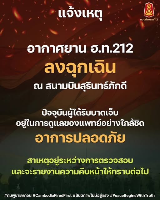 กองทัพภาคที่ 2 ขอเรียนชี้แจงว่า เมื่อวันที่ 22 ธันวาคม พ.ศ. 2568 เวลาประมาณ 17.19 น. อากาศยานเฮลิคอปเตอร์แบบ ฮ.ท.212 ของกองทัพบก ได้ประสบเหตุจำเป็นต้องลงฉุกเฉิน ขณะปฏิบัติการร่อนลง ณ สนามบินสุรินทร์ภักดี จังหวัดสุรินทร์ ส่งผลให้กำลังพลประจำอากาศยาน ได้รับบาดเจ็บ ทั้งนี้เจ้าหน้าที่ได้ควบคุมสถานการณ์และให้การช่วยเหลือผู้ประสบเหตุโดยทันที โดยไม่มีผลกระทบต่อความปลอดภัยของประชาชนในพื้นที่แต่อย่างใด