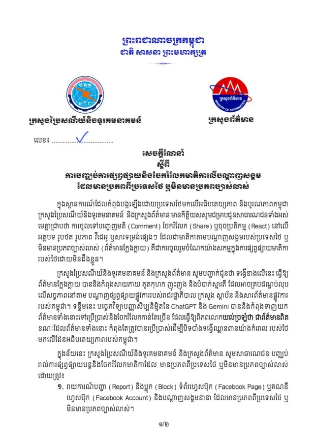 (พนมเปญ): ในสถานการณ์ที่ ประเทศไทยเกิดจากอํานาจอธิปไตยและสีสันของกัมพูชา กระทรวงการโพสต์และโทรคมนาคม และกระทรวงข้อมูลแจ้งว่าแสดงความคิดเห็น (Comment) แชร์ (Share) หรือแสดงปฏิกิริยาต่อบทความ รูปภาพ วิดีโอ หรือรูปแบบอื่นๆ ที่เป็นเนื้อหาสื่อสังคมออนไลน์ของไทย หรือสิ่งนั้น ไม่มีแหล่งที่มาที่ชัดเจน (Fake News) คือการมีส่วนร่วมในการโปรโมทเนื้อหา ใช่ โดยไม่รู้ตัว