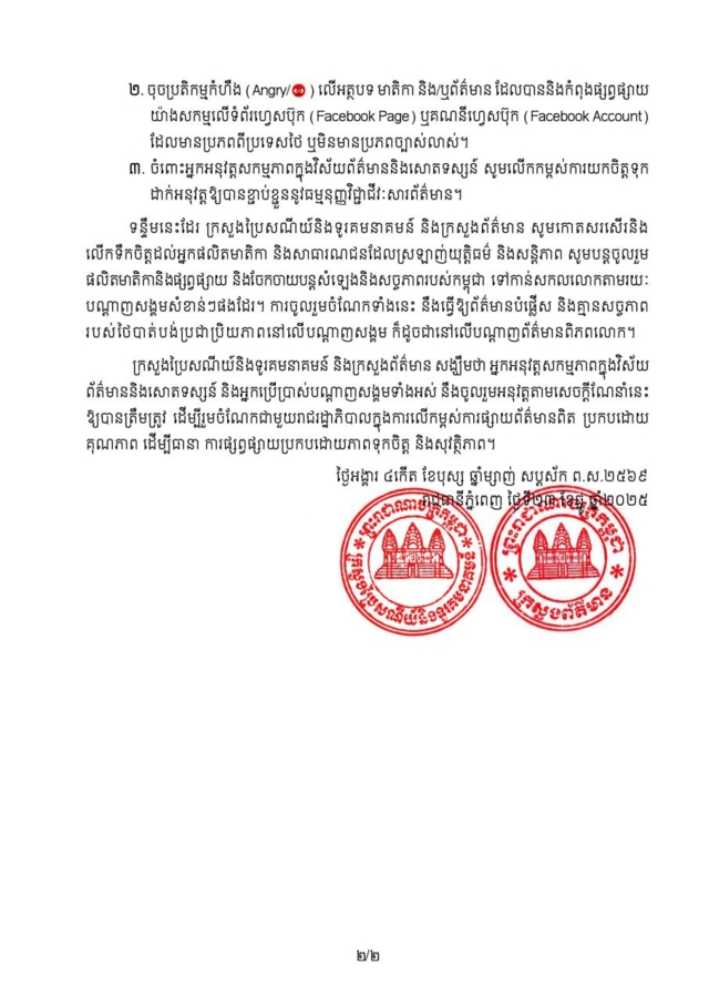 กระทรวงการไปรษณีย์และโทรคมนาคม ขอทราบว่า การกระทําข้างต้นทําให้เกิดข่าวปลอม สอดแนม จัดการ เท็จ ปลุกเสก และหมิ่นประมาทจิตวิญญาณที่สามารถปกปิดความจริงบนสื่อราชการของรัฐบาล กระทรวง สถาบัน และสื่อมวลชนอย่างเป็นทางการของกัมพูชา