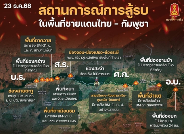 เมื่อเวลา 08.30 น. วันที่ 23 ธ.ค. 68 กองทัพภาคที่2 สรุปสถานการณ์ตามแนวชายแดนไทย–กัมพูชา ในหลายพื้นที่ของกองทัพภาคที่ 2 โดยภาพรวม ยังคงมีการประทะ กันในพื้นที่ จ.ศรีสะเกษและ จ.สุรินทร์ ขณะที่ฝ่ายไทยยังสามารถควบคุมสถานการณ์ในสนามรบไว้ได้ โดยทางฝ่ายกัมพูชายังคงใช้ จรวดหลายลำกล้อง BM-21 ยิงเป็นชุดเข้ามาฝั่งไทย เพื่อหวังกดดันและสร้างผลกระทบทางจิตวิทยา ขณะที่ฝ่ายไทยตอบโต้ด้วยการรวมอำนาจการยิงอย่างเป็นระบบ และใช้โดรนโจมตีเป้าหมายสำคัญ รวมถึงระบบการสื่อสารของฝ่ายตรงข้าม ทำให้ยังสามารถรักษาฐานที่มั่นไว้ได้ ทั้งนี่กำลังพลได้รับบาดเจ็บบางนาย