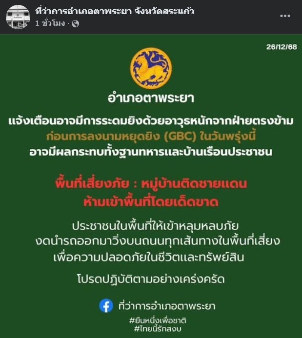 อำเภอตาพระยา จ.สระแก้ว แจ้งเตือนอาจมีการระดมยิงด้วยอาวุธหนักจากฝ่ายตรงข้าม ก่อนการลงนามหยุดยิง (GBC) ในวันพรุ่งนี้ อาจมีผลกระทบทั้งฐานทหารและบ้านเรือนประชาชน