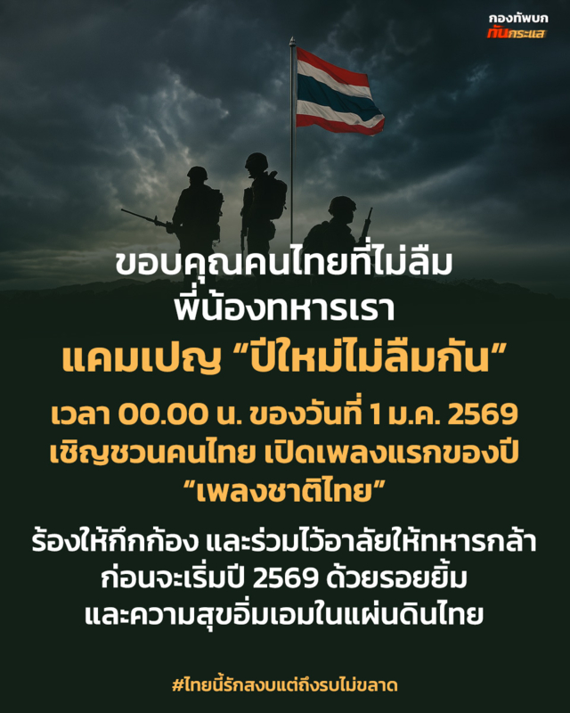 วันที่ 29 ธ.ค. 68 เฟซบุ๊กเพจ “กองทัพบก ทันกระแส” โพสต์ข้อความระบุว่า “ขอบคุณคนไทยที่ไม่ลืม พี่น้องทหารเรา แคมเปญ “ปีใหม่ไม่ลืมกัน” เวลา 00.00 น. ของวันที่ 1 ม.ค. 2569 เชิญชวนคนไทย เปิดเพลงแรกของปี “เพลงชาติไทย” ร้องให้กึกก้อง และร่วมไว้อาลัยให้ทหารกล้า ก่อนจะเริ่มปี 2569 ด้วยรอยยิ้ม และความสุขอิ่มเอมในแผ่นดินไทย