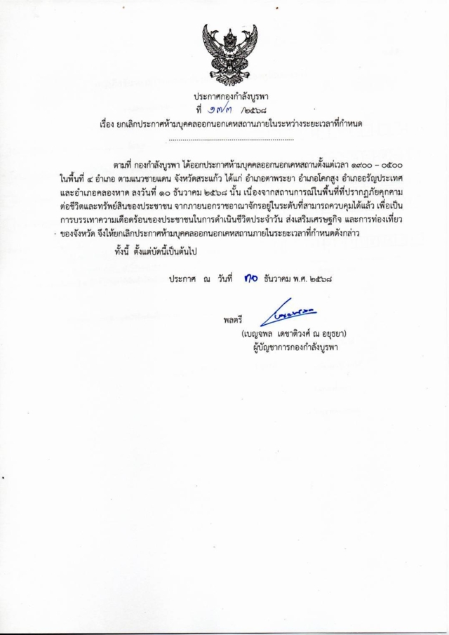 ตามที่ กองกำลังบูรพา ได้ออกประกาศห้ามบุคคลออกนอกเคหสถานตั้งแต่เวลา 19.00 - 05.00 น. ในพื้นที่ 4 อำเภอ ตามแนวชายแดน จ.สระแก้ว ได้แก่ อ.ตาพระยา อ.โคกสูง อ.อรัญประเทศ และ อ.คลองหาด ลงวันที่ 10 ธันวาคม 2568 นั้น เนื่องจากสถานการณ์ในพื้นที่ที่ปรากฎภัยคุกคามต่อชีวิตและทรัพย์สินของประชาชน จากภายนอกราชอาณาจักรอยู่ในระดับที่สามารถควบคุมได้แล้ว เพื่อเป็นการบรรเทาความเดือดร้อนของประชาชนในการดำเนินชีวิตประจำวัน ส่งเสริมเศรษฐกิจ และการท่องเที่ยวของจังหวัด จึงให้ยกเลิกประกาศห้ามบุคคลออกนอกเคหสถานภายในระยะเวลาที่กำหนดดังกล่าว
