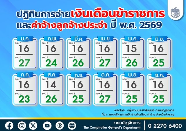 กรมบัญชีกลาง กระทรวงการคลัง อัปเดต ปฏิทินเงินเดือนข้าราชการ และค่าจ้างลูกจ้างประจำ ประจำปี พ.ศ. 2569 ครบทั้ง 12 เดือน โดยแบ่งจ่ายเดือนละ 2 รอบ