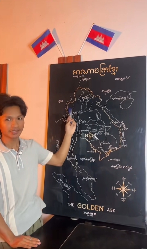 วันที่ 31 ธ.ค. 68 เฟซบุ๊กเพจ “Army Military Force” โพสต์คลิปวิดีโอ พร้อมข้อความระบุว่า “อินฟลูเอนเซอร์ชาวกัมพูชา เปิดสอนแผนที่ให้กับเด็กชาวเขมรรุ่นใหม่ทางออนไลน์ โดยเคลมดินแดนของไทย ลาว จีน เวียดนาม และมาเลเซีย ตั้งแต่ยุคสุโขทัย, ศรีเทพ, หลวงพระบาง, สิบสองปันนา, นครศรีธรรมราช และลังกาสุกะในคาบสมุทรมลายู ฯลฯ ทั้งหมดเคยเป็นส่วนหนึ่งของเขมรทั้งสิ้น แถมยังเปลี่ยนชื่อ อ่าวไทยเป็นอ่าวเขมรอีกด้วย นอกจากนี้ นางยังได้มีการจัดทำแผ่นที่ฉบับเคลมดินแดนดังกล่าวออกมาวางขายด้วย”