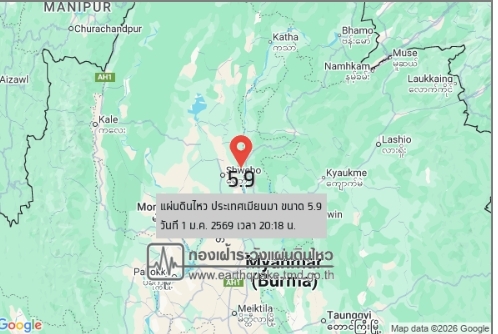 1 ม.ค. 69 เมื่อเวลา 20.18 น. กองเฝ้าระวังแผ่นดินไหว กรมอุตุนิยมวิทยา รายงานเกิดแผ่นดินไหวบนบก ขนาด 5.9 ความลึก 10 กม. บริเวณประเทศเมียนมา ทางทิศตะวันตกเฉียงเหนือของ อ.ปางมะผ้า จ.แม่ฮ่องสอน ประมาณ 423 กม. หากมีข้อมูลเพิ่มเติม ปภ.จะแจ้ง ให้ทราบต่อไป