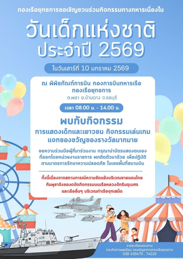 โดยปีนี้กองเรือยุทธการได้จัดกิจกรรมวันเด็กแห่งชาติที่พิพิธภัณฑ์การบิน กองการบินทหารเรือ กองเรือยุทธการ ต.พลา อ.บ้านฉาง จ.ชลบุรี ระหว่าง เวลา 08.00 น. – 14.00 น. พร้อมขอความร่วมมือผู้ที่มาร่วมงานนำบัตรแสดงตนเองที่ออกโดยหน่วยงานราชการ พกติดตัวมาด้วย เพื่อปฏิบัติ ตามมาตรการรักษาความปลอดภัยในเขตพื้นที่สนามบิน