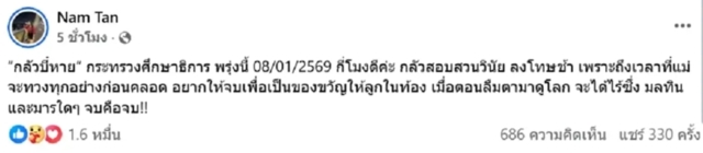 “กลัวบี๋หาย กระทรวงศึกษาธิการ พรุ่งนี้ 08/01/2569 กี่โมงดีคะ กลัวสอบสวนวินัยลงโทษช้า เพราะถึงเวลาที่แม่จะทวงทุกอย่างก่อนคลอด อยากให้จบเพื่อเป็นของขวัญให้ลูกในท้อง เมื่อตอนลืมตามาดูโลกจะได้ไร้ซึ่งมลทินและมารใด ๆ จบคือจบ!”