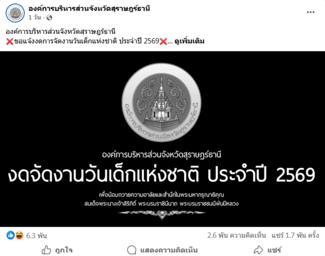 เมื่อวันที่ 9 มกราคม 2569 ที่จ.สุราษฎร์ธานี หลังจากเพจองค์การบริหารส่วนจังหวัดสุราษฎร์ธานี ได้โพสต์ ขอแจ้งงดการจัดงานวันเด็กแห่งชาติประจำปี 2569 เพื่อร่วมแสดงความอาลัยและน้อมรำลึกในพระมหากรุณาธิคุณสมเด็จพระนางเจ้าสิริกิติ์พระบรมราชชนนีพันปีหลวงด้วยความเคารพอย่างสุดซึ้ง ได้เพียง 1 วันปรากฏเกิดดรามาเป็นอย่างมาก