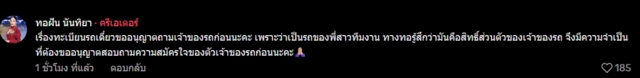 "เรื่องทะเบียนรถเดี๋ยวขออนุญาตถามเจ้าของรถก่อนนะคะ เพราะว่าเป็นรถของพี่สาวทีมงาน ทางทอรู้สึกว่ามันคือสิทธิ์ส่วนตัวของเจ้าของรถ จึงมีความจำเป็นที่ต้องขออนุญาตสอบถามความสมัครใจของตัวเจ้าของรถก่อนนะคะ🙏🏻"