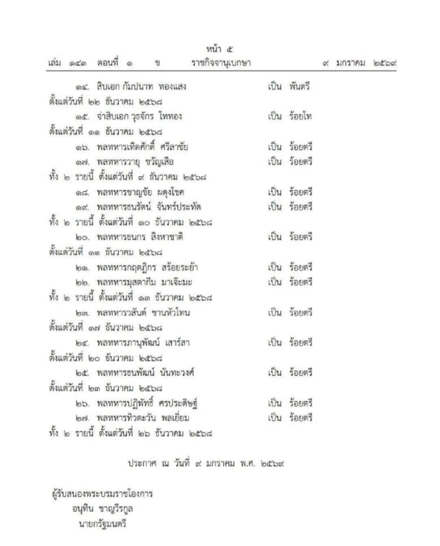 วันที่ 10 ม.ค. 69 เว็บไซต์ ราชกิจจานุเบกษา เผยแพร่ประกาศ สำนักนายกรัฐมนตรี เรื่องพระราชทานยศทหาร เป็นกรณีพิเศษ