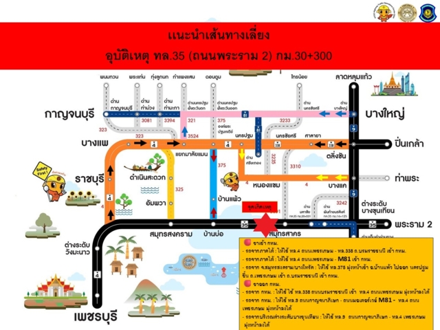 ศูนย์บริหารจัดการจราจรและอุบัติเหตุ กรมทางหลวง - HTOC ประชาสัมพันธ์ ให้ประชาชนใช้เส้นทางเลี่ยง เนื่องจากโครงสร้างเหล็กร่วงหล่น ทล.35 (ถนนพระราม 2) กม.30+300 หลีกเลี่ยงเส้นทาง และเผื่อเวลาในการเดินทาง โดยแนะนำเส้นทางเลี่ยง ดังนี้