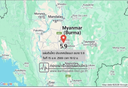 15 ม.ค. 69 เมื่อเวลา 19.12 น. กองเฝ้าระวังแผ่นดินไหว กรมอุตุนิยมวิทยา รายงาน เกิดเหตุแผ่นดินไหวบนบก ขนาด 5.9 ความลึก 10 กม. บริเวณประเทศเมียนมา ทางทิศตะวันตกเฉียงเหนือของ อ.เมือง จ.แม่ฮ่องสอน ประมาณ 259 กม. หากมีข้อมูลเพิ่มเติม ปภ. จะแจ้งให้ทราบต่อไป