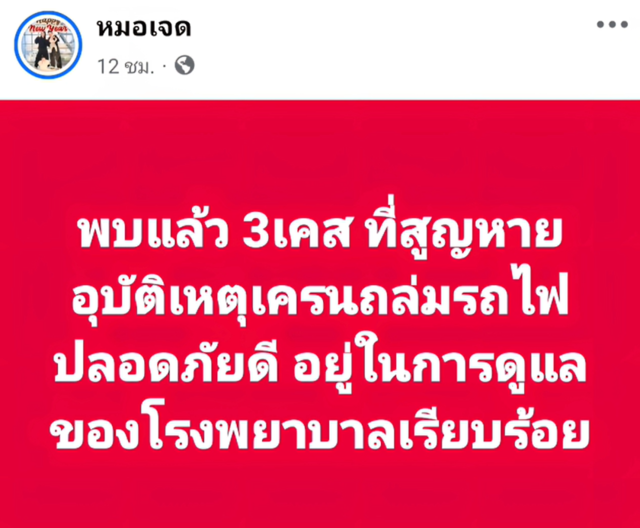 ด้านนายแพทย์เจษฎ์ บุณยวงศ์วิโรจน์ รองผู้อำนวยการโรงพยาบาลมหาราชนครราชสีมา ได้โพสต์ในเฟสบุ๊ก "หมอเจต" ข้อความว่า พบแล้ว 3 เคส ที่สูญหายอุบัติเหตุเครนถล่มรถไฟปลอดภัยดี อยู่ในการดูแลของโรงพยาบาลเรียบร้อย และขอบคุณทีมพิสูจน์หลักฐาน ทีมนิติเวช ทีมปกครอง และอีกหลายชุดที่กล่าวไม่หมด ลุยงานตั้งแต่เช้าจนกว่าจะเคลียร์หมด ตอนโพสต์นี้ก็เที่ยงคืนแล้วนะ