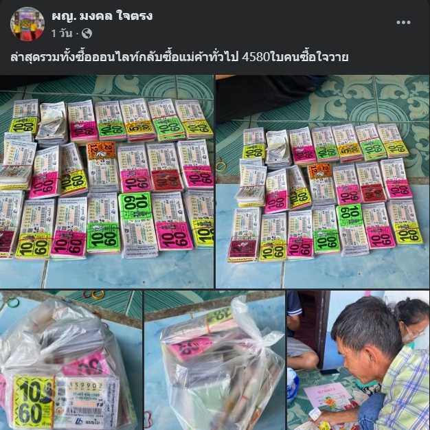 ล่าสุด ผู้ใช้เฟซบุ๊ก ผญ. มงคล ใจตรง ได้โพสต์ชวนตะลึงหลังมีคนถูกรางวัลเลขท้าย 2 ตัวกว่า 4 พันใบ โดยระบุข้อความว่า “ล่าสุดรวมทั้งซื้อออนไลน์กับซื้อแม่ค้าทั่วไป 4580 ใบคนซื้อใจวาย”