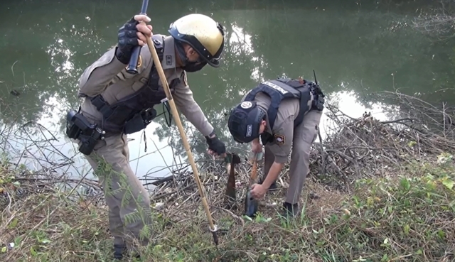 จากการสอบถามนายเกียรติศักดิ์ ชาวป่า อายุ 33 ปี ผู้ที่พบเห็นวัตถุต้องสงสัยเป็นคนแรก บอกว่า ขณะที่กำลังออกหาดักจับหนูนาอยู่บริเวณริมตลิ่งลำน้ำทวนก็ไปพบเห็นวัตถุต้องสงสัยดังกล่าวโดยบังเอิญ ตอนแรกตนตกใจจนขาอ่อน เพราะคิดว่าเป็นวัตถุระเบิดอย่างแน่นอน จึงได้ถอยห่างออกจากจุดดังกล่าว พร้อมกับได้โทรศัพท์แจ้ง 191 เพื่อให้เจ้าหน้าที่ตำรวจไปตรวจสอบดังกล่าว