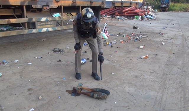 ซึ่งจุดที่พบวัตถุต้องสงสัย อยู่บริเวณริมตลิ่งลำน้ำทวน บริเวณด้านหลังร้านรับซื้อของเก่าแห่งหนึ่ง ตั้งอยู่ถนนเลี่ยงเมืองยโสธร ต.ในเมือง อ.เมือง จ.ยโสธร ซึ่งระดับน้ำในลำน้ำทวนได้ลดต่ำลงจึงมองเห็นวัตถุดังกล่าว จำนวน 2 ลูกทิ้งอยู่ริมตลิ่ง ลักษณะเป็นแท่งเหล็กหล่อสีฟ้า มีหางเสือรูปทรงหยดน้ำ และมีน้ำนักไม่ต่ำกว่า 10 กิโลกรัม