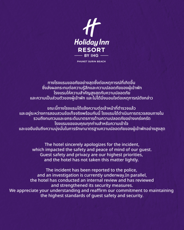 (19 ม.ค. 2569) เพจ Holiday Inn Resort Phuket Surin Beach ได้ออกมาโพสต์ข้อความขอโทษพร้อมชี้แจงถึงเหตุการณ์ มีคนใช้มาสเตอร์คีย์พยายามบุกห้องดีเจสาวที่เข้าพักในโรงแรม ก่อนที่จะถูกจับกุมในเวลาตร่อมา