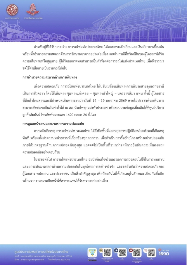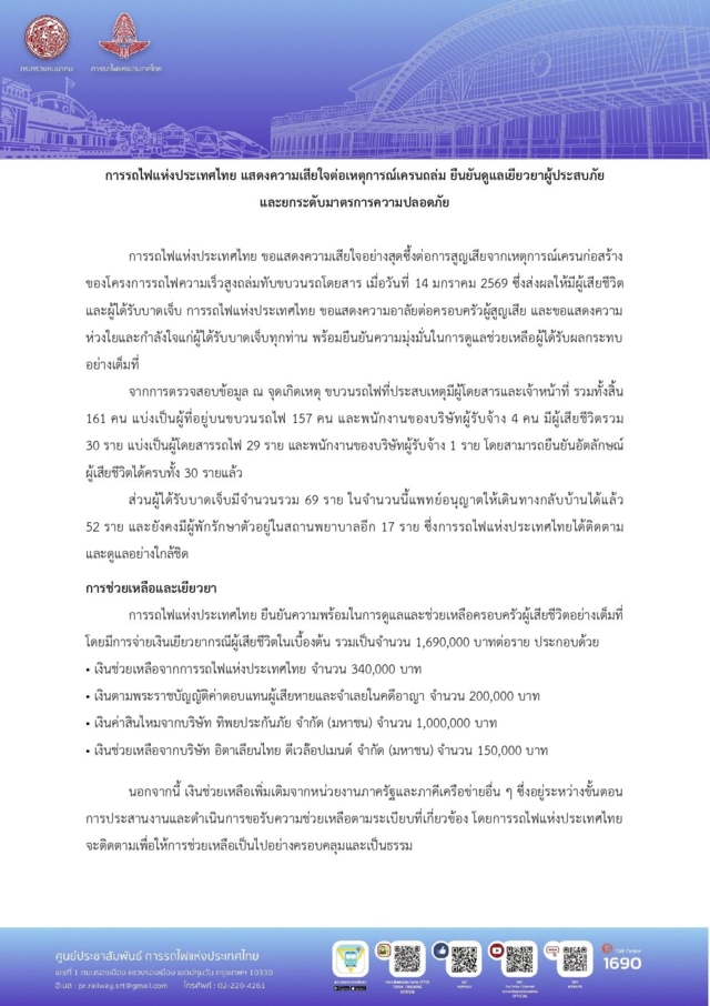 (19 ม.ค. 2569) การรถไฟแห่งประเทศไทย ขอแสดงความเสียใจอย่างสุดซึ้งต่อการสูญเสียจากเหตุการณ์เครนก่อสร้างของโครงการรถไฟความเร็วสูงถล่มทับขบวนรถโดยสาร เมื่อวันที่ 14 มกราคม 2569 ซึ่งส่งผลให้มีผู้เสียชีวิตและผู้ได้รับบาดเจ็บ การรถไฟแห่งประเทศไทย ขอแสดงความอาลัยต่อครอบครัวผู้สูญเสีย และขอแสดงความห่วงใยและกำลังใจแก่ผู้ได้รับบาดเจ็บทุกท่าน พร้อมยืนยันความมุ่งมั่นในการดูแลช่วยเหลือผู้ได้รับผลกระทบอย่างเต็มที่