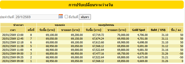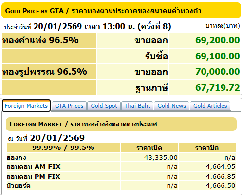 (20 ม.ค. 2569) สมาคมค้าทองคำ ประกาศราคาทองประจำวันที่ 20 มกราคม 2569 โดยเปิดตลาดรอบแรก ราคาทองคงที่ มีการปรับขึ้น-ลง แล้ว 9 ครั้ง ล่าสุด ราคาทองรูปพรรณ แตะ 70,050 บาท ทองคำแท่ง 69,250 บาท
