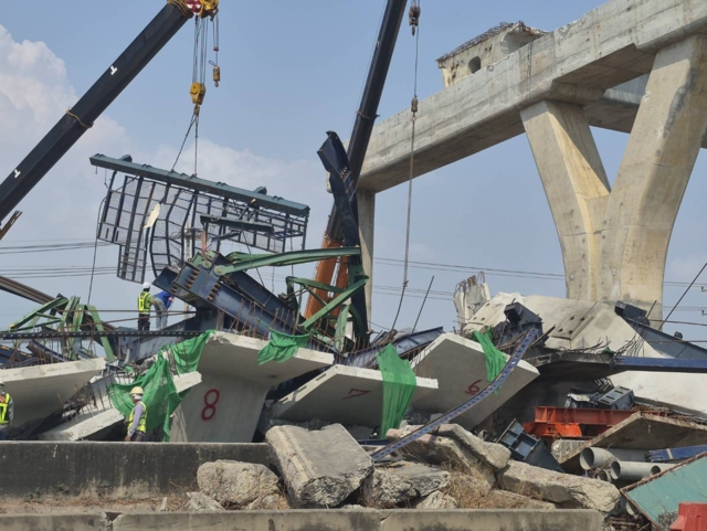 ต่อมาเวลา 13.00 น. คนงานได้กลับมาเริ่มการรื้อถอนซากเครน และแผ่นพื้นสะพานที่ถล่มลงมา โดนการนำหัวเจาะ มาเจาะย่อยชิ้นส่วนของซากแผ่นพื้นสะพาน และเอาเครนยกชิ้นส่วนที่เป็นเหล็กของจากจุดเกิดเหตุ ขณะเดียวกันทีมข่าวยังพบว่าได้มีการนำรถน้ำ มาจอดฉีดน้ำบริเวณซากจุดเกิดเหตุที่เพิ่งเกิดไฟไหม้เมื่อช่วงเช้าเพื่อเป็นการป้องกันไม่ให้เกิดเหตุซ้ำ ส่วนภายในไซด์งานมีทีมวิศวกรผู้เชี่ยวชาญของ บริษัท อิตาเลียนไทย ดีเวล๊อปเมนต์ จํากัด (มหาชน) และ เจ้าหน้าที่จากกรมทางหลวง มาคอยตรวจสอบความเรียบร้อย และความปลอดภัยภายในไซด์งานตลอดการเคลื่อนย้าย