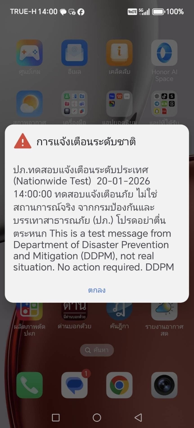 (20 ม.ค. 2569) เวลา 14.00 น. ณ ห้องประชุม 1 ปภ. กรมป้องกันและบรรเทาสาธารณภัย ร่วมกับกระทรวงดิจิทัลเพื่อเศรษฐกิจและสังคม กสทช. และผู้ให้บริการเครือข่ายบริษัทโทรคมนาคมแห่งชาติ จำกัด (มหาชน) บริษัท ทรูคอร์ปอเรชั่น จำกัด (มหาชน) และบริษัท แอดวานซ์ อินโฟร์ เซอร์วิส จำกัด (มหาชน) ทดสอบระบบการแจ้งเตือนภัยผ่านสัญญาณโทรศัพท์เคลื่อนที่ (Cell Broadcast) ระดับประเทศ (Nationwide Test) โดยมีนายอรรษิษฐ์ สัมพันธรัตน์ ปลัดกระทรวงมหาดไทย เป็นประธานฯ พร้อมด้วยผู้แทนจากกระทรวงดิจิทัลเพื่อเศรษฐกิจและสังคม กสทช. กรมส่งเสริมการปกครองท้องถิ่น พร้อมทั้งหน่วยร่วมปฏิบัติงานห้องปฏิบัติการ (War Room) เพื่อการแจ้งเตือนภัยของชาติ ได้แก่ กรมอุตุนิยมวิทยา สำนักงานทรัพยากรน้ำแห่งชาติ กรมชลประทาน สำนักงานพัฒนาเทคโนโลยีอวกาศและภูมิสารสนเทศ (องค์การมหาชน) กรมทรัพยากรธรณี กรมทรัพยากรน้ำ สถาบันสารสนเทศทรัพยากรน้ำ กรมประชาชนสัมพันธ์ กรมควบคุมมลพิษ กรมควบคุมโรค สำนักงานตำรวจแห่งชาติ และผู้ว่าราชการจังหวัดทุกจังหวัด กรุงเทพมหานคร อำเภอ และองค์กรปกครองส่วนท้องถิ่น เข้าร่วมรับการทดสอบและติดตามผลผ่านระบบอิเล็กทรอนิกส์ ณ ที่ตั้งในพื้นที่