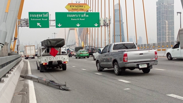 พร้อมข้อความระบุว่า “บนสะพานภูมิพล2 จากฝั่งปู่เจ้า มุ่งหน้าสุขสวัสดิ์ เป็นเหล็กของรถที่กระจกแตกค่ะ เบรกกะทันหัน #ศูนย์ข่าวเขื่อนขันธ์”