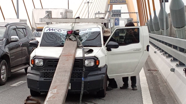 โดยเหตุการณ์ดังกล่าวเกิดขึ้น เนื่องจากรถบรรทุกเหล็กเบรกกะทันหัน เพราะมีรถตัดหน้า ทำให้เหล็กไหลลงไปด้านหน้ารถ ก่อนจะเสียบเข้าด้านหน้ารถ โชคดีที่คนขับหลบทัน ไม่มีผู้ได้รับบาดเจ็บ