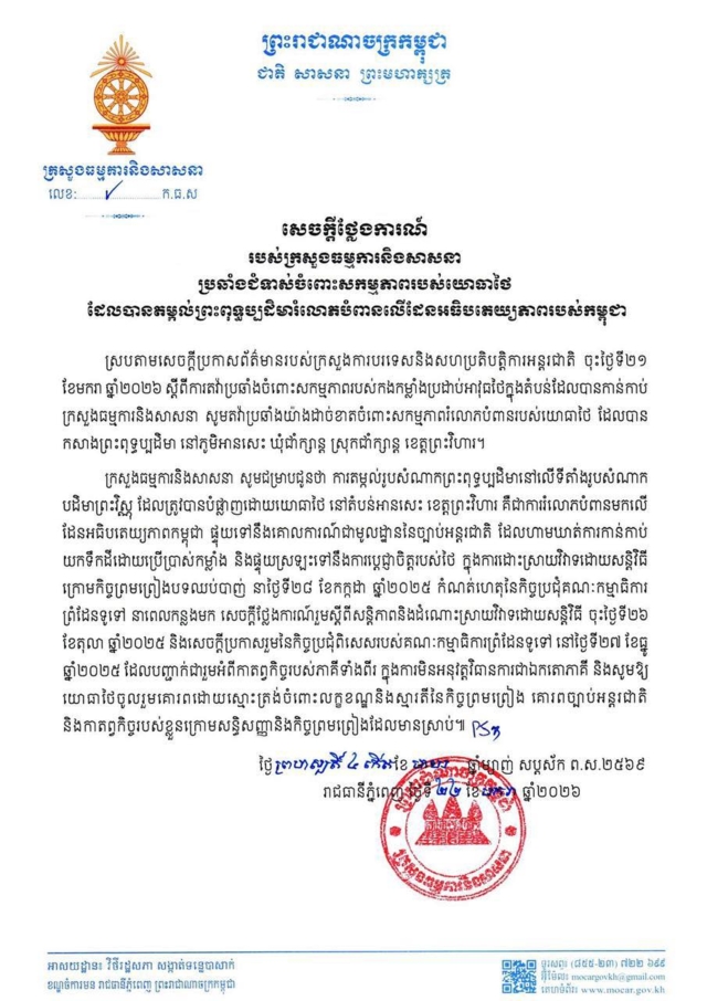 วันที่ 22 ม.ค. 69 สำนักข่าว Fresh News English สื่อออนไลน์ของกัมพูชา รายงานข่าวว่า กระทรวงวัฒนธรรมและศาสนาแห่งราชอาณาจักรกัมพูชา ออกแถลงการณ์เมื่อวันพฤหัสบดี (22 มกราคม) แสดงการประท้วงอย่างรุนแรงต่อการกระทำที่ละเมิดอธิปไตยของกองทัพไทย ซึ่งได้ติดตั้งพระพุทธรูปในหมู่บ้านอันเสส ตำบลเชิงซาน อำเภอเชิงซาน จังหวัดพระวิหาร