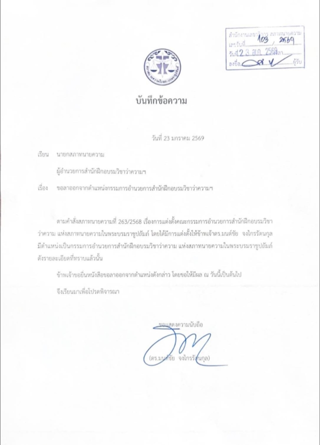 เพื่อประโยชน์แห่งความยุติธรรม และเพื่อให้กระบวนการต่าง ๆ ดำเนินไปอย่างเป็นอิสระและปราศจากข้อกังขา ทนายแก้ว หรือ ดร.มนต์ชัย จงไกรรัตนกุล ได้ยื่นหนังสือลาออกจากตำแหน่งกรรมการอำนวยการสำนักฝึกอบรมวิชาว่าความเป็นที่เรียบร้อยแล้ว การตัดสินใจดังกล่าวถือเป็นการแสดงความรับผิดชอบในส่วนของบุคคล มิใช่การยุติหรือชี้ขาดข้อเท็จจริงใด ๆ แต่อย่างใด
