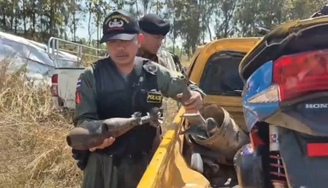 ด.ต.วิฑิต เศลารักษ์ ผู้บังคับหมู่กองกำกับการสืบสวนภูธร จ.บุรีรัมย์ เจ้าหน้าที่ชุด EOD กล่าวว่า วัตถุระเบิดที่พบจากรถยนต์ที่ประสบอุบัติเหตุ ประกอบด้วย กระสุนปืน ค ขนาด 60 มิลลิเมตร 2 ลูก , ขนาด 81 มิลลิเมตร 1 ลูก และขนาด 100 มิลลิเมตร อีก 1 ลูก ทั้งหมด 4 ลูกสภาพค่อนข้างเก่า ซึงได้เก็บกู้นำส่งพนักงานสอบสวน เพื่อส่งไปตรวจพิสูจน์ที่กองสรรพาวุธสำนักงานตำรวจแห่งชาติ เบื้องต้นคาดว่าน่าจะเป็นของฝั่งกัมพูชา แต่ก็ต้องรอผลตรวจพิสูจน์อีกครั้ง นอกจากนั้นยังพบปะทัดยักษ์ หรือระเบิดแรงต่ำ อีกจำนวนหนึ่ง ซึ่งจะส่งให้พนักงานสอบสวนดำเนินการต่อไป