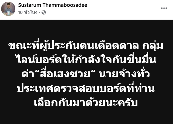 ล่าสุดนายษัษฐรัมย์ ธรรมบุษดี กรรมการประกันสังคม ฝ่ายผู้ประกันตน ได้โพสต์เฟซบุ๊กเปิดเผยว่า “ขณะที่ผู้ประกันตนเดือดดาล กลุ่มไลน์บอร์ดให้กำลังใจกันชื่นมื่น ด่า ‘สื่อเฮงซวย’ นายจ้างทั่วประเทศตรวจสอบบอร์ดที่ท่านเลือกกันมาด้วยนะครับ”