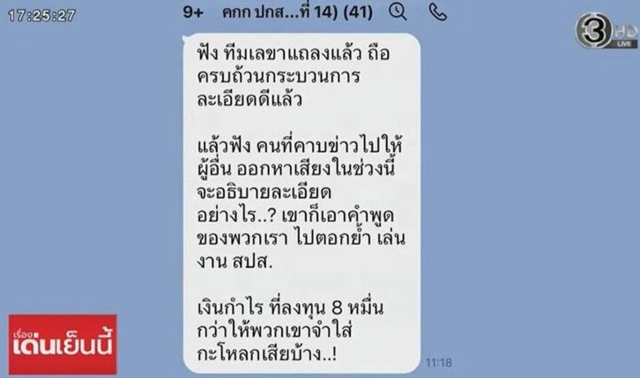 ขณะที่ รายการเรื่องเด่นเย็นนี้ ได้เปิดเผยภาพบทสนทนาฉบับเต็ม โดยเป็นข้อความในกรุ๊ปไลน์ชื่อว่า “คกก ปกส…ที่ 14” มีสมาชิกในกลุ่มดังกล่าว 41 ราย มีการส่งข้อความว่า “พี่ให้กำลังใจน้อง…มากๆๆๆครับ สื่อเฮงซวยยยยยย” จากนั้นคนที่ถูกกล่าวถึงได้ตอบข้อความว่า “ขอบคุณในกำลังใจที่มอบให้ผมครับ….”